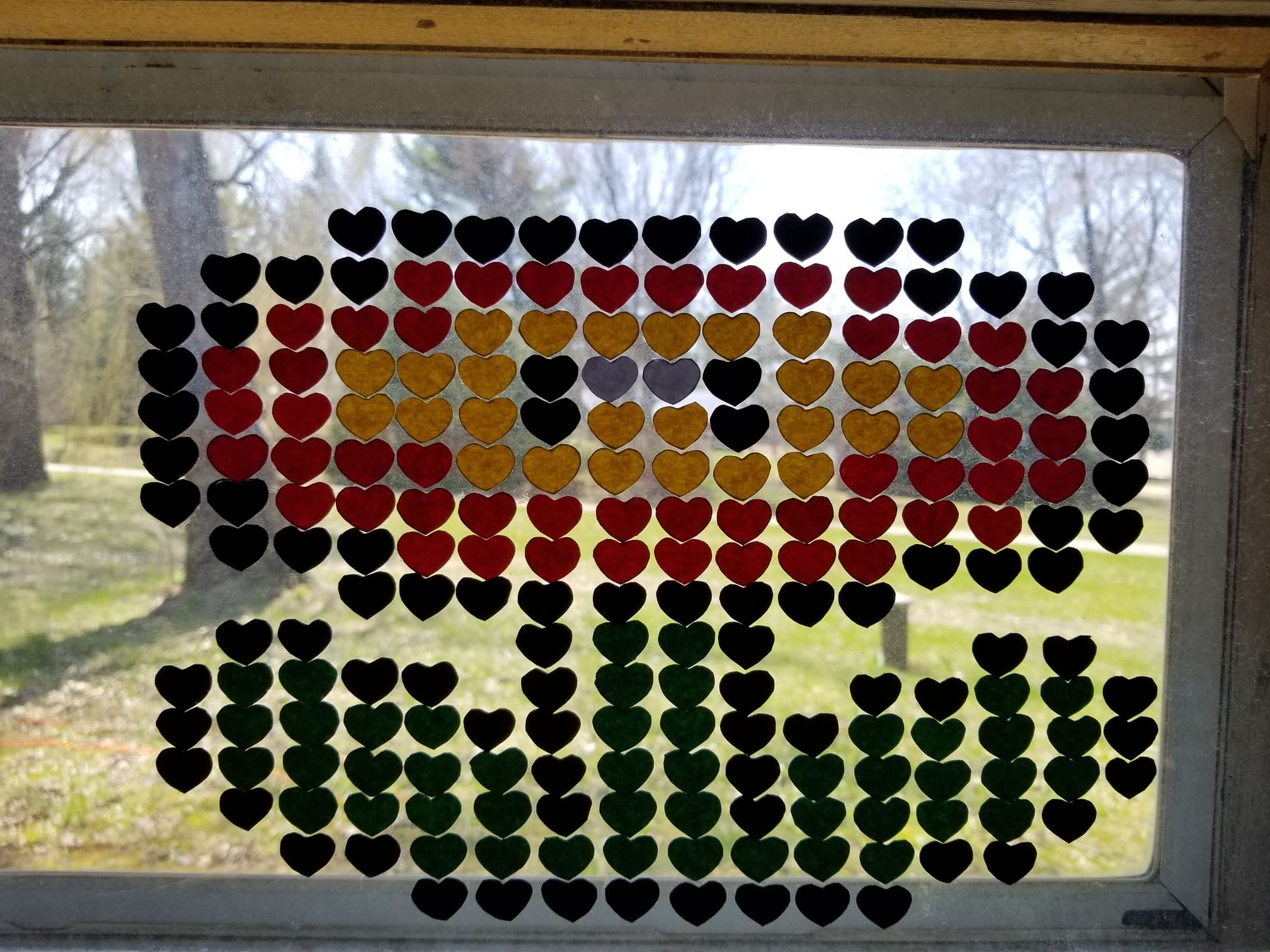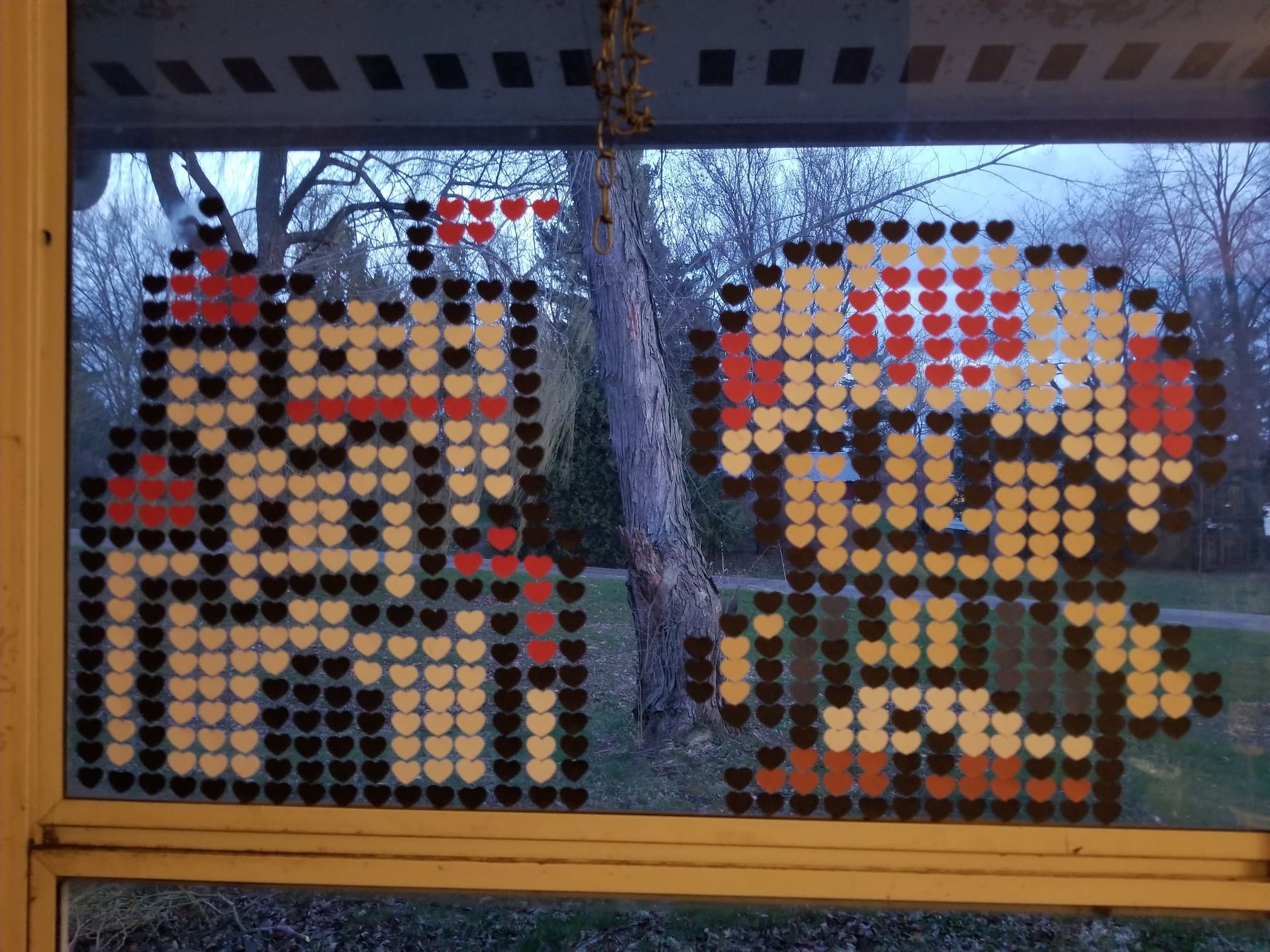 Shawna decided to stay sane by creating some pixel art on Mom’s windows. She spent a good amount of time cutting out tons of little hearts to glue to the windows to form Nintendo characters. It’s pretty cool! You can check out the pictures below, but we also made a you tube video of her process.
